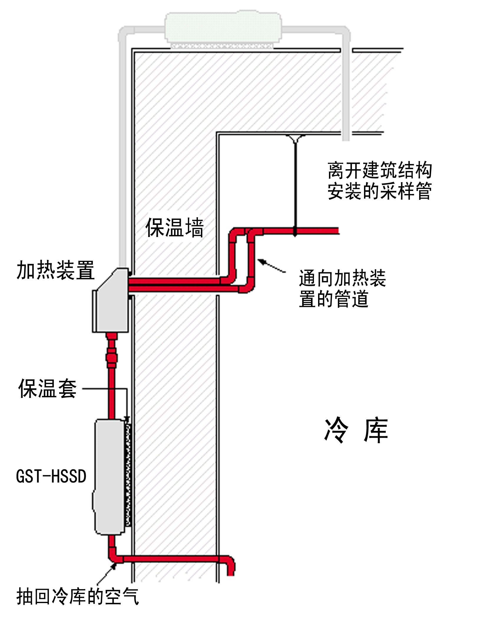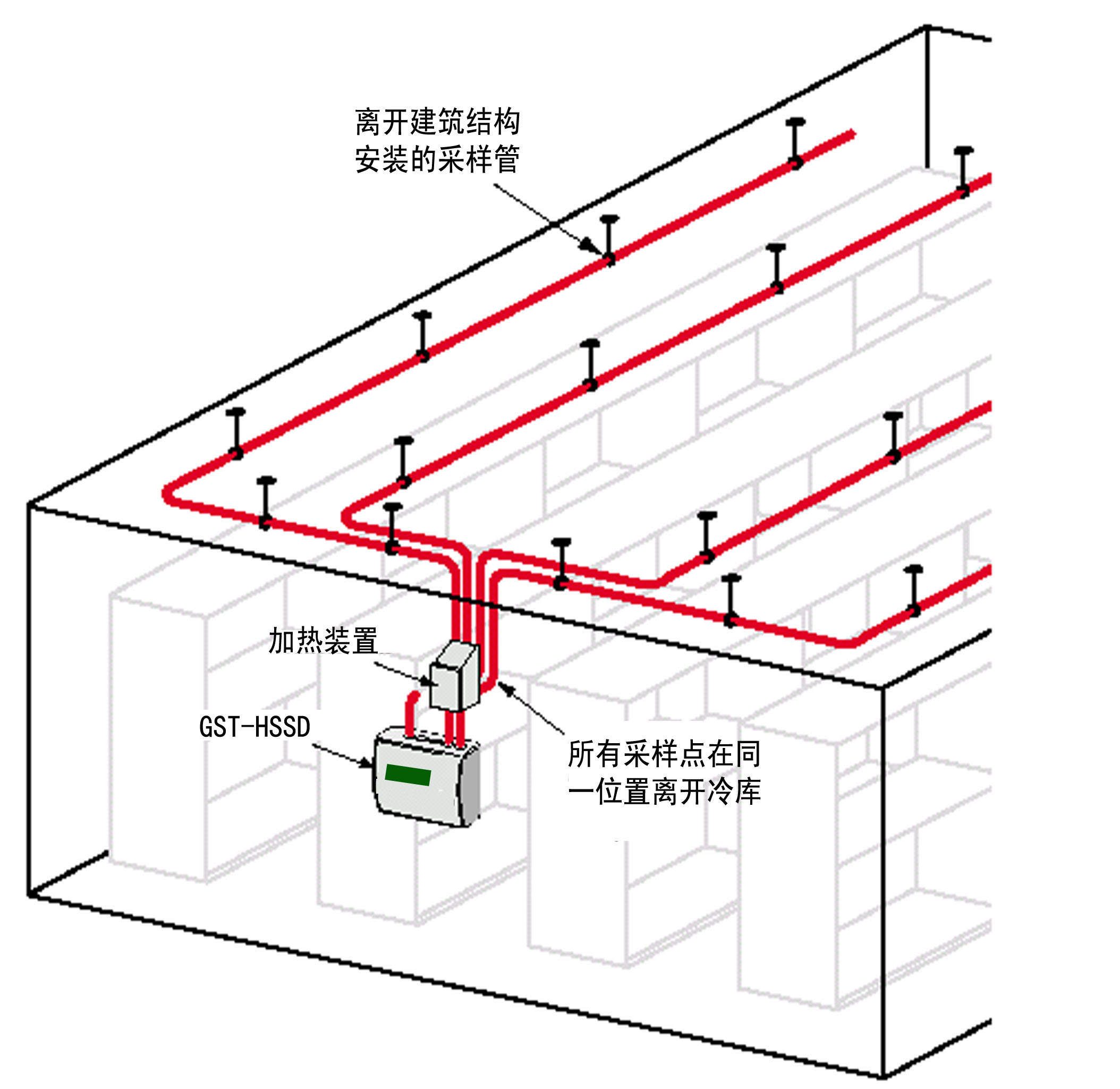 冷庫中采樣管,加熱箱和吸氣式感煙火災探測器的相對位置